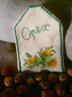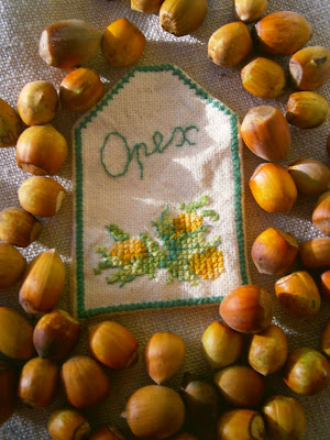 Дизайн с буклета "Nature au point de croix". Слово "орех" вышивала вообще без схемы, поэтому вы можете увидеть мой корявый почерк:)
